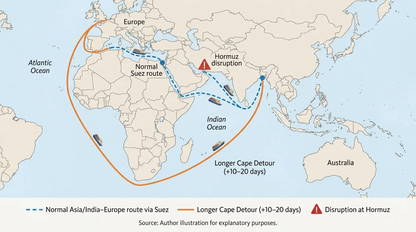 How Hormuz disruption forces Asia–Europe cargo to detour via the Cape, adding 10–20 days and extra fuel and freight costs