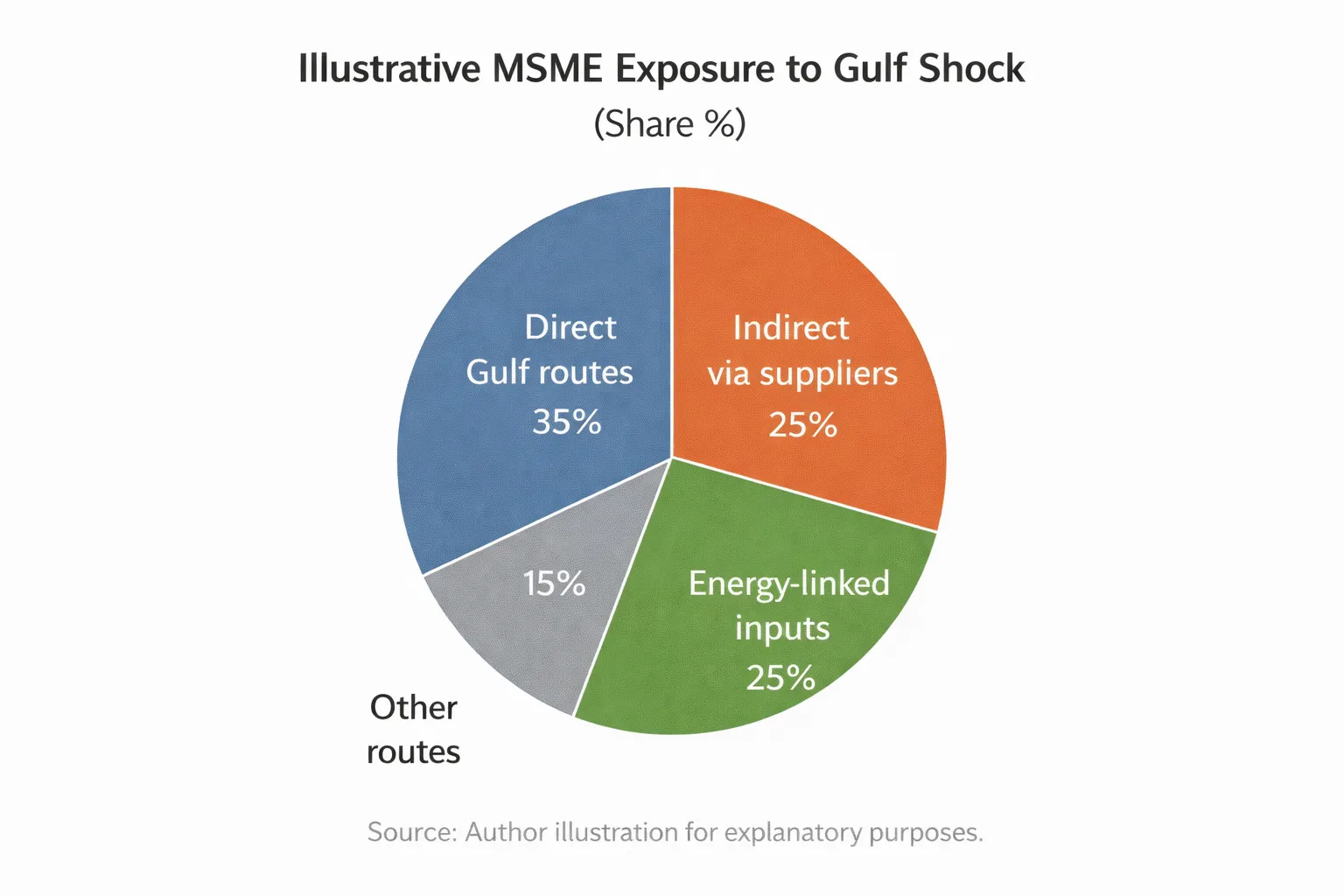 Illustrative breakdown of how a typical MSME’s exposure to the Gulf shock can be split across routes and inputs (for planning, not forecasting).